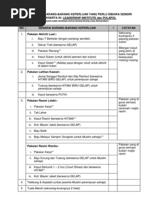 Berikut ini adalah daftar keperluan yang dapat dan perlu dibawa dalam perkemahan.