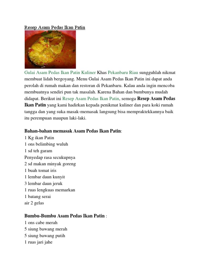 Asam pedas ikan patin misalnya. Asam pedas ikan patin (foto:ilustrasi/pinterest). Dagingnya yang lembut dan segar ini akan terasa nikmat saat dikombinasikan dengan sensasi pedas dari kuahnya. Berikut resep pindang patin yang bisa dicoba sendiri di rumah Everyone has their own interpretation for this favorite dish and there are endless adaptations;