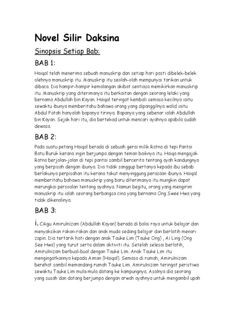 Sinopsis Silir Daksina Bab 3 - Adakah anda calon spm 2018?. Tersingkap rahsia sinopsis haiqal begitu teruja membaca manuskrip berkulit biru muda yang setebal 58 muka surat. Bab 3 (i) secangkir kopi o pekat menjadi penemanku untuk bersengkang mata sehingga dinihari. Sinopsis yazmayı öğrenmek için ilk önce sinopsis nedir sorusuna bir cevap vermek gerekir. Berikutnya ialah nota novel silir daksina termasuk sinopsis, tema novel, plot, persoalan, watak perwatakan, nilai pengajaran dan gaya bahasa. Sebuah manuskrip lama ya allah ya rabbi ampunkan dosa kami.